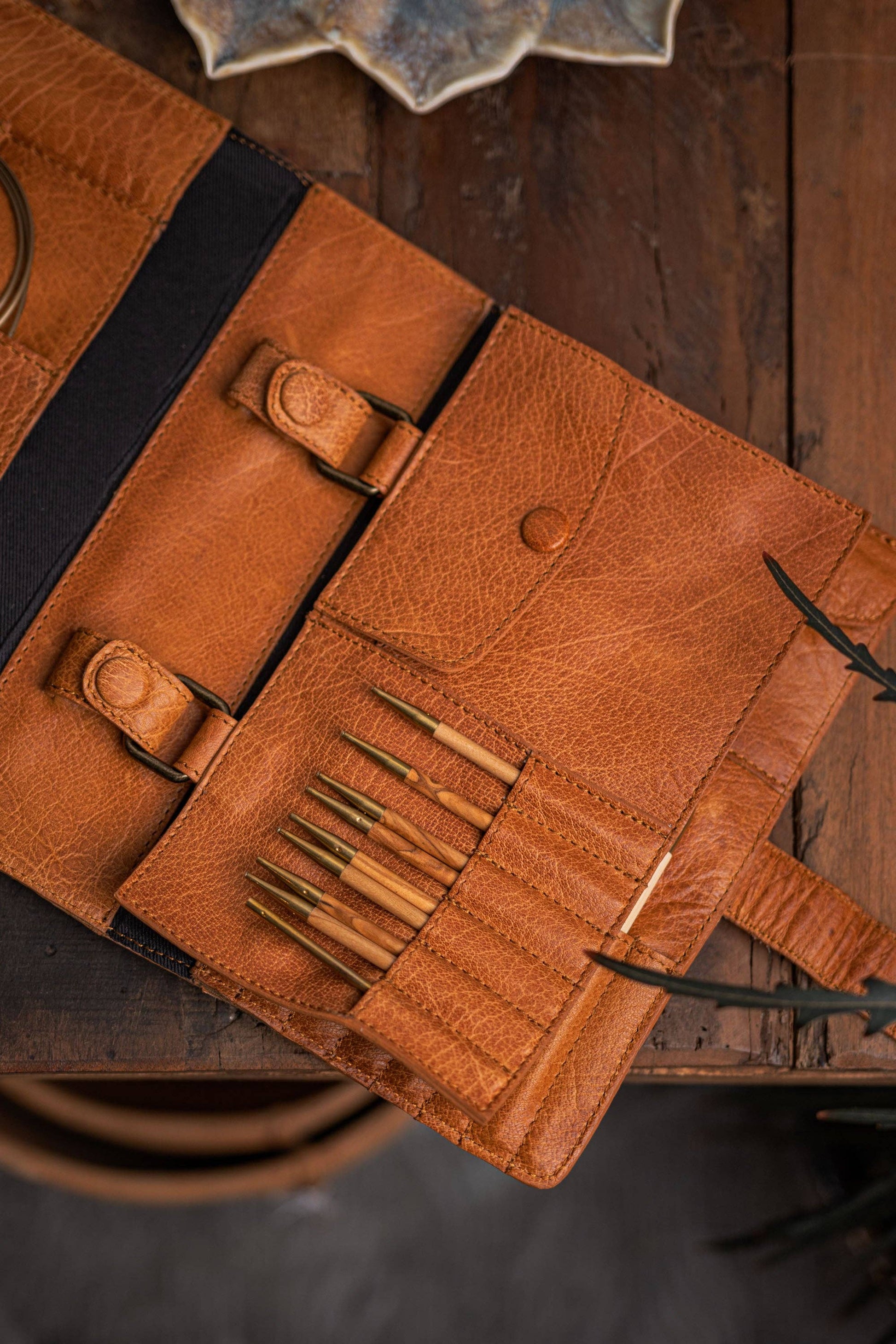 This beautiful leather case combines style and practicality. The Carita B has room for your interchangeable needles. The case is secured with two round metal rings that can be attached to the Carita case.