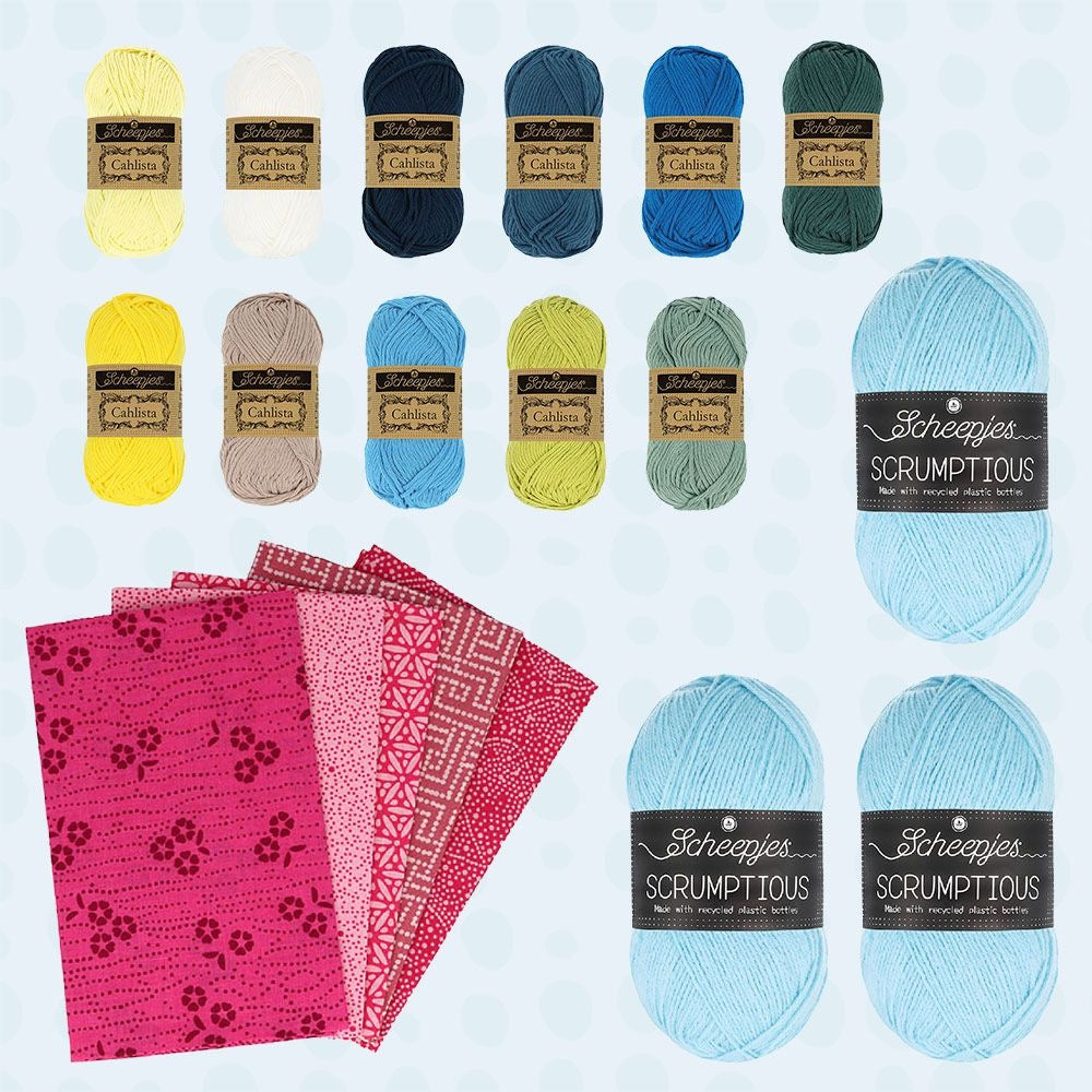 3 x Scheepjes Scrumptious of 100 grams with a running length of 300 metres per ball11 x Scheepjes Cahlista of 15 grams with a running length of 25.5 metres per ball1 x Tissu de Marie fat quarter pack with 5 coloured pieces of fabric measuring 50 x 57cm1 x tapestry needle1 x sticker sheet1 x yarn organizer1 x set of 3 postcardsThe free crochet and knitting pattern is available via the Scheepjes website in Dutch, English (UK & US) and German and via the official Scheepjes Facebook groups. Of course, you will also need knitting or crochet hooks and accessories for both versions.